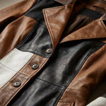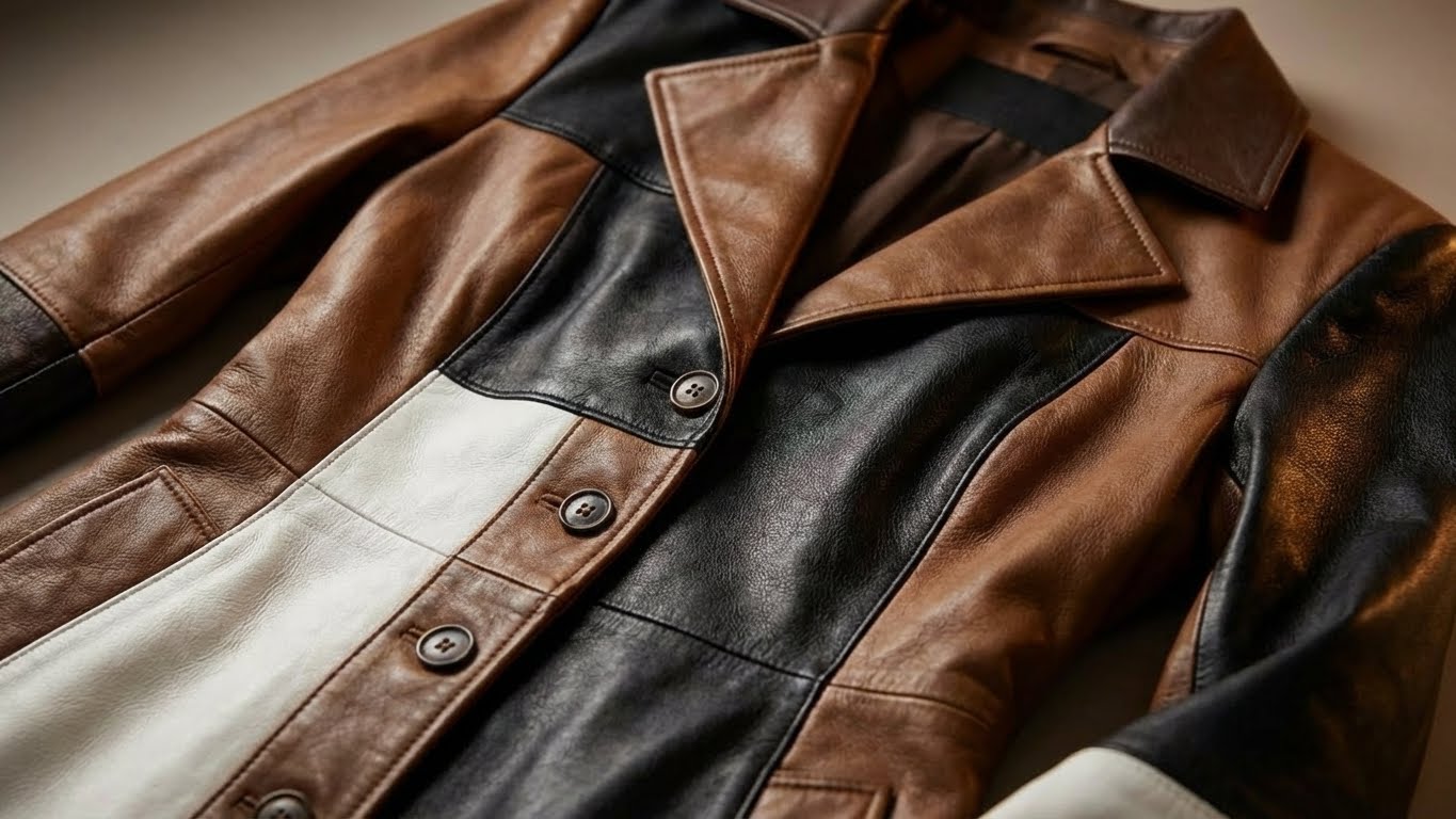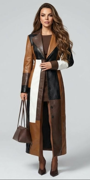 Design: Multicolour patchwork in camel, brown, black and white tones